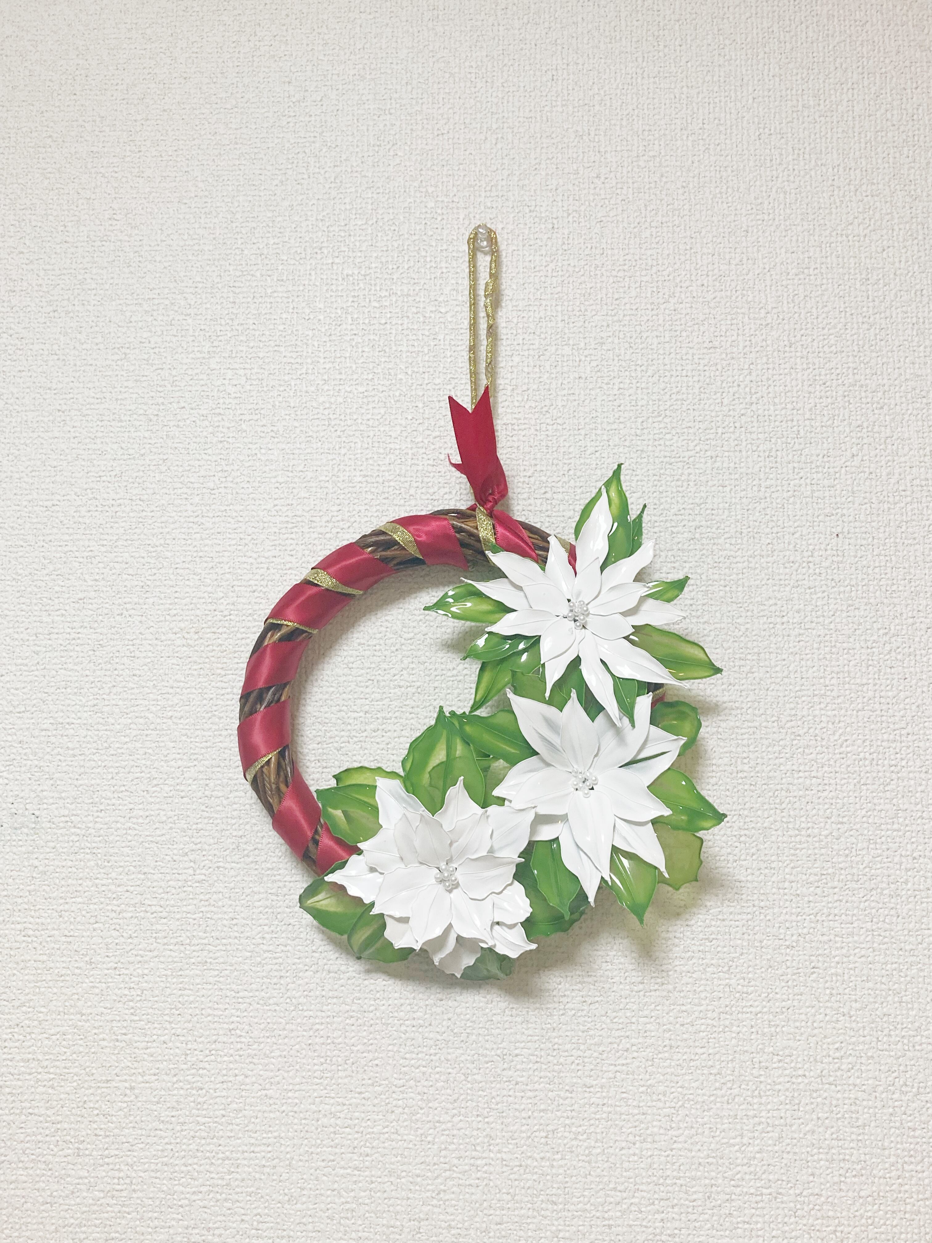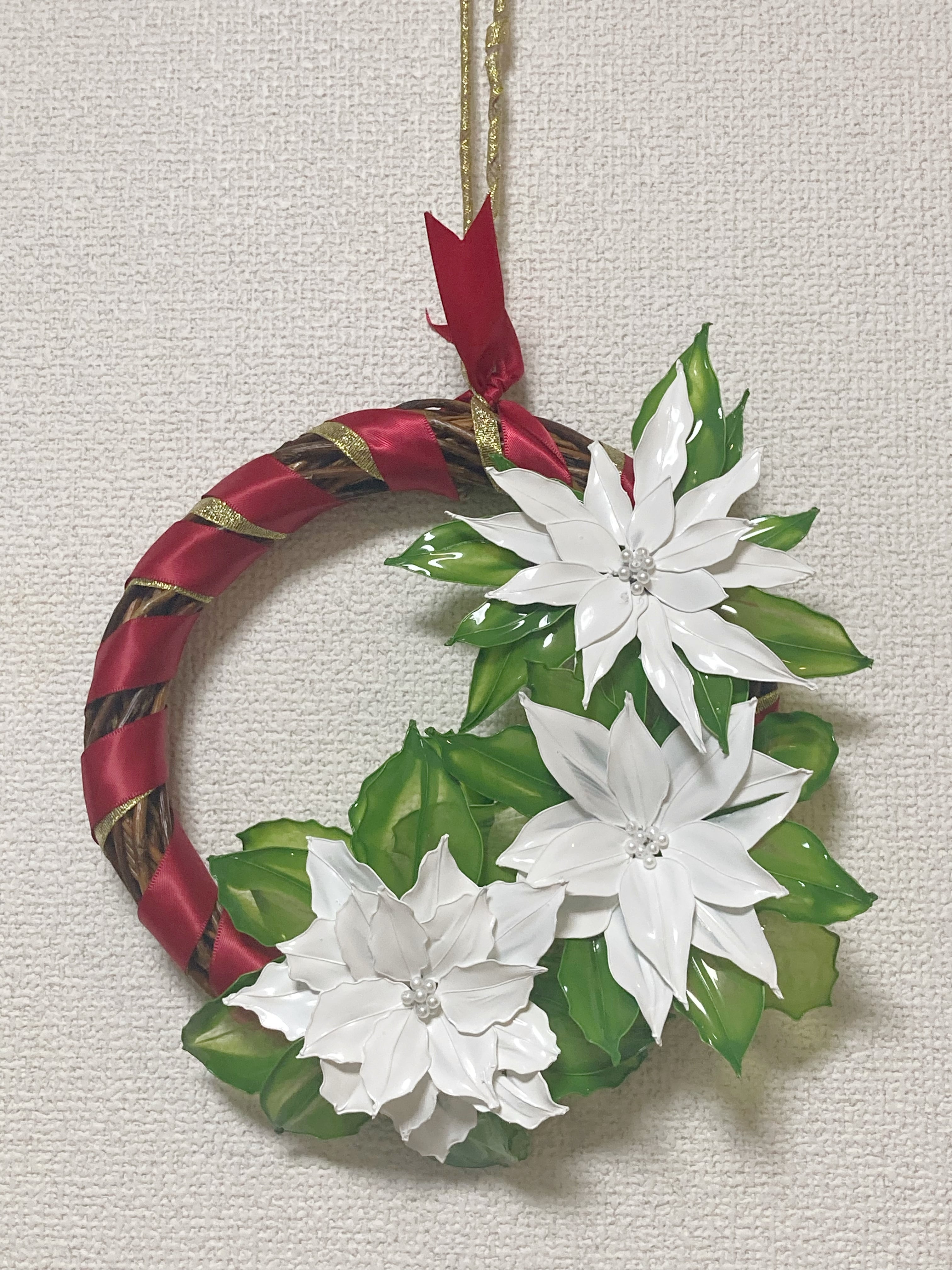 赤いリボンが巻かれたリースに、ガラスの花のように透きとおった白いポインセチアが咲きました。